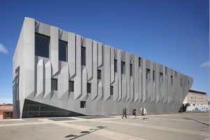 乍看之下很難想像這座以灰鋁板呈現出層層凹凸外立面的建築原來是一間音樂中心,外觀大膽地運用了鋁複合板,形成如高科技狀的皺褶狀外立面,這也是受到日本摺紙工藝的影響。