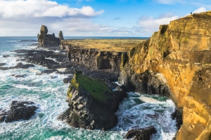 高達75公尺,本身是玄武岩,因為火山活動下噴發物沉積,才形成不規則的形狀,而這裡也被當地人稱作「怪物海岸」,遠遠看過去,就像是張牙舞爪的怪物,爬行在海岩的姿態一樣,若來此天氣好,則可以看到壯闊的海岸線。