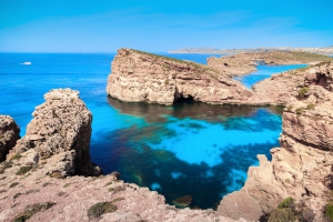 Blue Lagoon 位於地中海中心地帶,但它剛好處在兩個島嶼之間,因此創造出了天然的差談及海水浴場,吸引了大量的遊客前來享受如同藍寶石般的海水,盡情在大海裡游泳,甚至還能潛水。