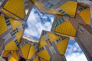 設計理念是為鹿特丹這個工業城市創造一個趣味性很強的建築,為城市增添一點生氣。方塊屋於1978年設計,在1984年竣工。這些以45度角傾斜的黃色立方體,彷彿一座座顛倒的樹屋,不只是城市的象徴,更是二戰後城市重生、大膽創新的象徵。