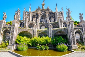 由波羅梅奧家族於17世紀打造,屬典型的巴洛克風格。花園以階梯式設計聞名,共分十層平台,佈滿雕像、噴泉與奇花異草,構成壯觀的立體景觀。四季花卉盛開,孔雀漫步其間,展現自然與藝術的完美融合,被譽為義大利最華麗的湖畔花園之一。