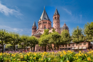 教堂建築採羅曼式風格,沉穩平衡,相較於後來歐洲常見追高的哥德式教堂,羅曼式建築屬於更上一代的建築形式。已有千年歷史。美茵茲是政教古都,在神聖羅馬帝國時代,美茵茲大主教身兼帝國七大選帝侯之一、並駐蹕在此,政治與宗教勢力權傾一時。
