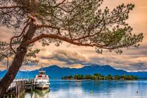 位於巴伐利亞阿爾卑斯山北麓,面積約80平方公里,被譽為「巴伐利亞之海」,是德國第三大湖泊。湖光山色如詩如畫,碧波映照雪峰,氛圍清新怡人。湖中三座島嶼各具特色:赫倫島為最大島,矗立赫倫基姆湖宮;弗勞恩島以修道院與漁村聞名;卡濟島則為無人島。
