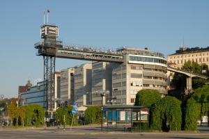 細長的塔身與橫跨街道的空中走廊(Skyway),展現了強烈的幾何感與結構力量。它不僅是電梯,更是連接低地濱海區與高地 Södermalm 住宅區的垂直交通樞紐。這種「垂直城市」的設計思維,在當時極具前瞻性。