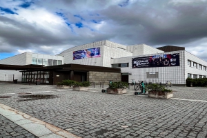 劇院外觀延續了市政廳的藍色陶瓷磚元素,但造型更加奔放。巨大的舞台塔頂部呈現不對稱的幾何切割,而大廳設計充滿了阿奧托式的「街道感」,寬敞的玻璃幕牆將外部廣場的景色引入了室內。