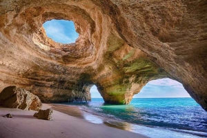 石灰懸壁經風浪長年淘蝕、雕鑿出隱蔽又別有洞天的洞穴,頂部坍塌形成巨大天窗,頂棚洞口灑入的光線造就奇異靜謐的空間,有如大教堂內光影編織的無色彩的純粹!岩壁色澤層疊映照細沙海水,奇幻光景令人沉浸其中!