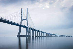 橫跨葡萄牙塔霍河口,於1998年啟用,以紀念航海家達伽馬發現印度航線五百週年。全長約17.2公里,是歐洲最長的橋樑之一。橋身以斜張橋與高架路段結合而成,象徵現代工程與探索精神。車行其上,可遠眺里斯本與廣闊河景,氣勢壯麗非凡。