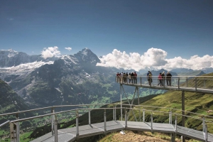六人座纜車提供舒適體驗,沿途可欣賞艾格峰北壁、少女峰及伯恩高地全景。抵達山頂後,First Cliff Walk懸崖步道讓遊客俯瞰阿爾卑斯山脈壯麗景色。另可自費體驗First Flyer飛索、First Glider滑翔等活動。