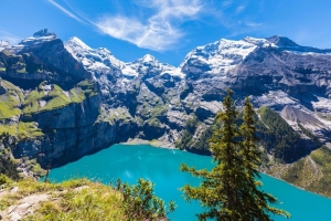 是誰把一顆藍寶石,深藏在遺世獨立、海拔1600公尺的瑞士山間?位在伯恩州歐士能山腰的歐士能湖(Oeschinensee),又被稱為「山中湖」,因為湖面藍得不可思議的表情,也被稱為「高山藍湖」。