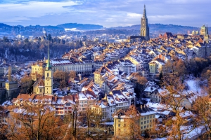 瑞士首都又稱噴泉城,緩步沿著古拙典雅◎舊城區幹道前行,中間是人車共行石板地,每隔一、兩百公尺就有座噴泉。街道兩旁則有◎騎樓迴廊,櫛比鱗次戶戶挨著;迴廊建築有半隱身路面街道下,原防禦工事的空間,現在地下室的空間及一樓已多為◎商店街或者◎餐廳。