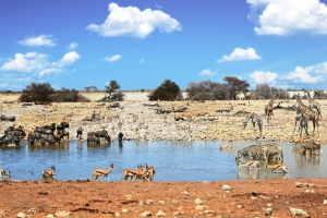 在奧萬博人(Ovambo)語當中就是「終年乾枯之白色大地」,世界最大野生動物保護區之一,地處乾旱地區,每年降雨量有限,為了保護野生動物,公園內修建並維護著許多人工飲水池,在旱季,可直接開車到這些飲水點附近,看著成群結隊的食草動物在飲水。