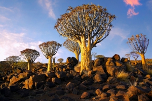箭袋樹是納米比亞的代表性植物,樹幹粗壯,形狀奇特,過往布希曼人以其為天然的箭袋。其生長環境乾燥、酷熱,與周圍的岩石地形相互交融,形成壯麗的景觀。納米比亞南部的基斯特曼胡普區域則有非洲範圍最大、數量最多,由約近百棵箭袋樹組成的森林。