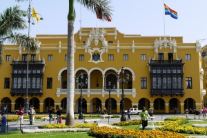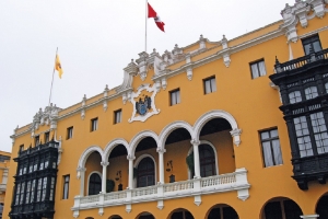 廣場西側的一排黃色建築是政府辦公機關,這個建築是利馬市政府的所在地。在西班牙殖民地時期,這就是利馬的第一個市政廳,經歷過歷史上多次地震和火災破壞後再重建,如今只有美麗的木製陽台結構還保留著原有風格。