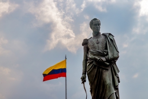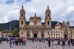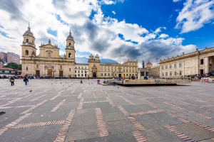 波哥大的◎主廣場,兩旁店鋪雲集,非常熱鬧,是休閒放鬆的好去處。廣場中有一座獨立英雄暨哥倫比亞◎第一任總統Simón Bolívar的雕像,這是該市的第一座公共紀念碑,廣場周圍有司法院、國會大廈、波哥大主教教堂和總統府。