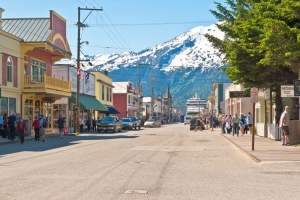 Skagway史凱威在阿拉斯加當地印第安Tlingit族的語意為「北風之家」,原本只是個默默無名的小鎮,1898年克朗代克淘金潮期間,成為最繁榮的淘金古鎮之一。