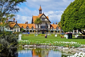 突出於羅托魯阿半島上的政府花園,是19世紀時毛利人捐獻給紐西蘭政府的土地,對於毛利人來說別具意義,色彩繽紛的豔麗花卉在此綻放,是市民最喜愛的休憩場所之一,花園內設施完善,有玫瑰花園、都鐸風格的羅托魯阿博物館、西班牙風格的藍浴場等歷史建築。