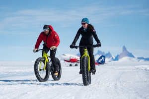 南極大陸上騎胖胎自行車,這是一種越野自行車,專為適應大輪胎(通常為3.8英寸或更大,輪輞為2.16英寸或更大)而製造,目的在降低地面壓力,以允許在雪,沙,沼澤和泥濘等柔軟,不穩定的地形上騎行。