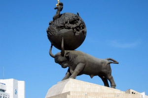 1998年10月6日建成。紀念碑分為上下兩部分,上部是一隻十五米長的青銅公牛,公牛的頸上頂著一個皸裂的球體--象徵著地球,設計思想取材於突厥民族的傳說:他們認為地球是由一頭巨牛馱著。