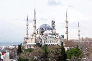 興建於1616年的藍色清真寺,因其內部的「伊茲尼克靛藍磁磚」而得名。寺內有多彩的玻璃窗,透射進來陽光映在藍白磁磚上異常美麗,是伊斯蘭裝飾藝術的經典。建築師當時逾矩設計的六根細長宣禮塔,至今仍是多數人津津樂道的故事。