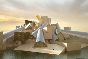 由美國建築大師Frank Gehry操刀,以不規則的幾何立方體元素穿插聚合而成,並與周圍的沙漠景觀及海景相呼應,這也將是古根漢美術館迄今為止最大的一座分館。