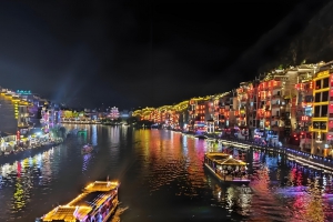 夜遊船遊覽鎮遠古城美麗的夜景。