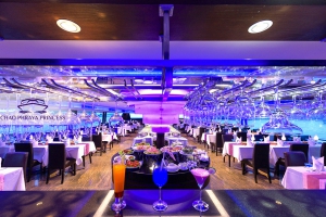 登上公主號,在甲板或船艙大啖海鮮料理與各式美食,同時欣賞兩旁令人目眩神迷的城市夜景,大皇宮、玉佛寺、鄭王廟,在夜色中更顯華麗璀璨,氣勢非凡。船上更有樂團現場演奏,在浪漫的氛圍中度過美好的晚餐時光。