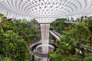 擁有世界最高40公尺的室內雨旋渦瀑布,瀑布中央貫穿玻璃穹頂,氣勢磅礴。四周環繞森林谷花園,種植數萬株熱帶植物,宛如機場中的綠色奇蹟,是拍照、散步與療癒的絕美空間。