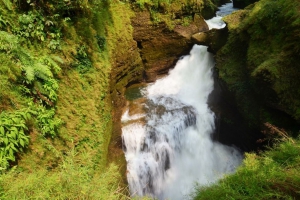 當地人又稱為地獄瀑布,是喜馬拉雅山融雪侵蝕切割而成的瀑布,水源則來自費娃湖,湖水在此落至數十公尺的斷崖下,湍急流水不斷侵蝕切割塞堤河谷兩岸,形成險峻的峽谷瀑布景觀,而瀑布在地底下方形成一個暗幽的深潭,頗是壯觀。