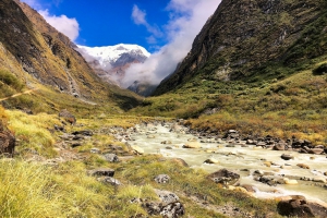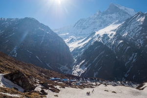魚尾峰是安娜普納山脈中的一座神秘的山峰,在當地人心目中是一座神山,至今魚尾峰還是處女峰。魚尾峰基地營是觀賞魚尾峰、安娜普納南峰、安娜普納III和康加普納峰(Gangapurna,7455公尺)的最佳觀景台之一。西側就是安娜普納峰的ABC。