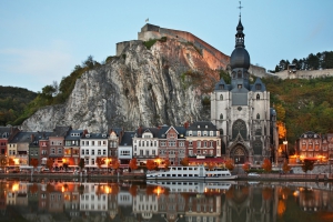 有比利時最美小鎮的美名,也是蕯克斯風發明者阿道夫的故鄉。大教堂位於西元1228年倒塌的羅馬式教堂原址上,磚瓦廊柱間流露的哥德與巴洛克風格蘊含深度的古典韻致,教堂後方百米高峭壁上的迪南城堡,讓迪南擁有懸岸小鎮的別名。