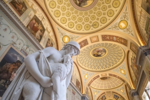 昔⽇為沙皇的宮殿及住所,最早是凱蕯琳⼤帝的私⼈的博物館,1922年起改為隱⼠盧博物館。以豐富的館藏聞名於世,列名世界四⼤博物館之⼀,擁有超過三百萬件的藝術作品。其中西歐油畫包含14-20世紀的收藏,其中包括達⽂西、畢卡索、拉斐爾等名人作品。