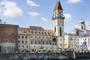 位於德國城市帕紹舊城區的一座典型的德式建築,高高的塔樓上面有着一口古老的機械大鐘,每逢正點時都會敲響洪亮的鐘聲,聲音傳測老陳的上空,真是有着濃濃的復古氣息。