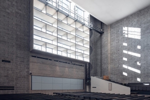 教堂外觀如同一個沈穩的矩形盒子,甚至常被戲稱為「地堡」,高側窗讓自然光柔和地灑在灰磚牆面上,營造出空靈且具層次感的氛圍。室內完全沒有華麗的裝飾、聖像或祭壇畫,被譽為最「禁欲系」的現代教堂。