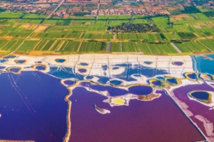 中國最大的鹽湖,與茶卡鹽湖齊名,位於柴達木盆地南部,由於水分不斷蒸發,鹽湖上形成堅硬的鹽蓋,青藏鐵路和青藏公路直接修建於鹽蓋之上,察爾汗鹽湖蘊藏有豐富的氯化鈉、氯化鉀、氯化鎂等無機鹽,總儲量達500多億噸,為中國礦業基地之一。