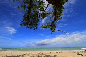 一片漂浮在海面上,月牙形的潔白沙灘。退潮之時漫步在沙灘戲水,碧海、藍天、白雲,美不勝收。