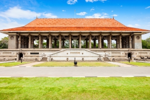 仿希臘古建築式,位於迦勒海灘GALLE FACE BEACH三尊古砲的正後方,一棟金黃色充滿藝術味道的建築物,這是斯里蘭卡的舊國會,1930~1982年之間的政治議會中心,現在議會大廳還保留著,後段的建築由斯里蘭卡的財政部在使用。