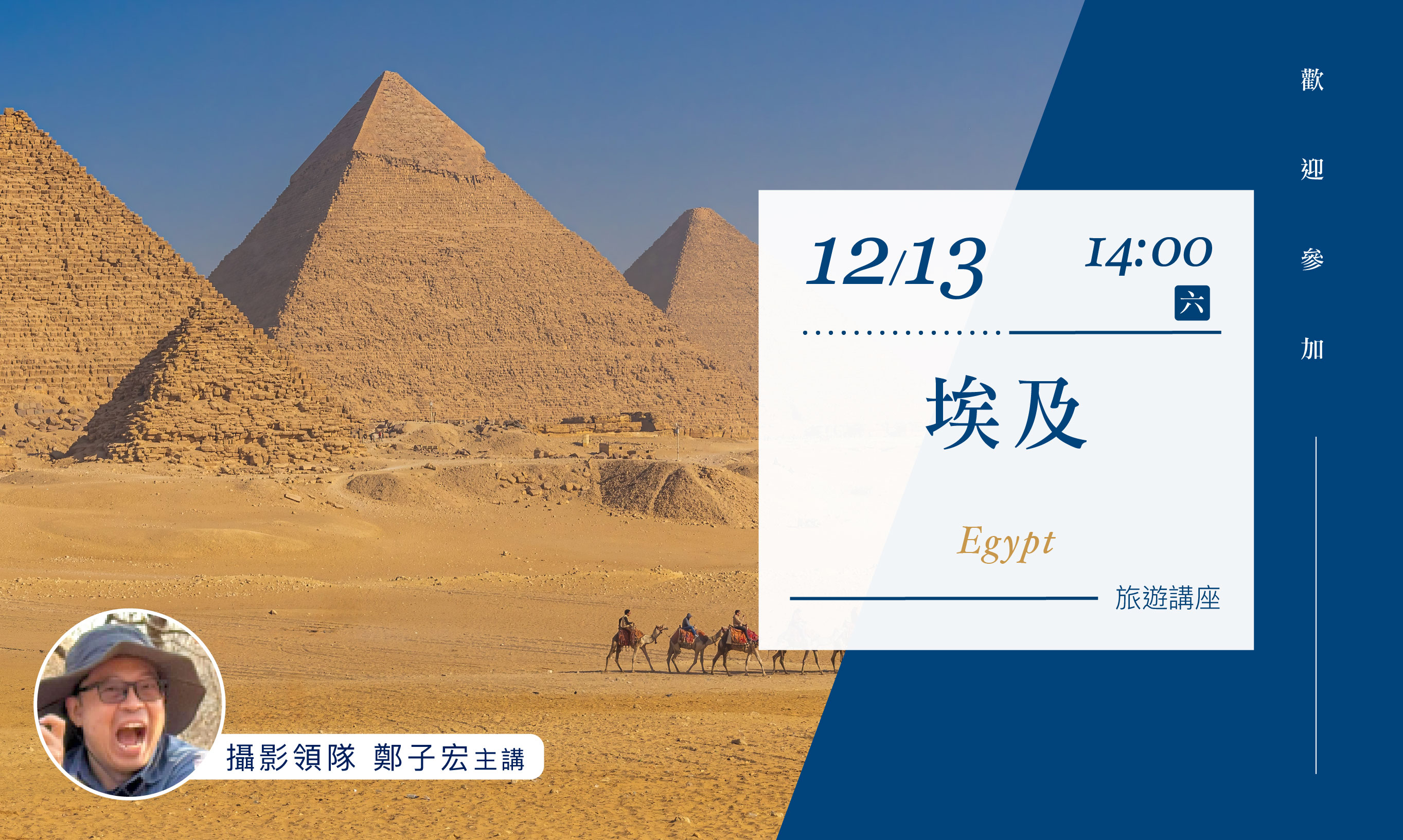 快來講座現場,聽攝影領隊 鄭子宏分享埃及最迷人的景點,帶您一步步走進法老王的時光世界,讓這趟夢幻旅程從此刻開始。