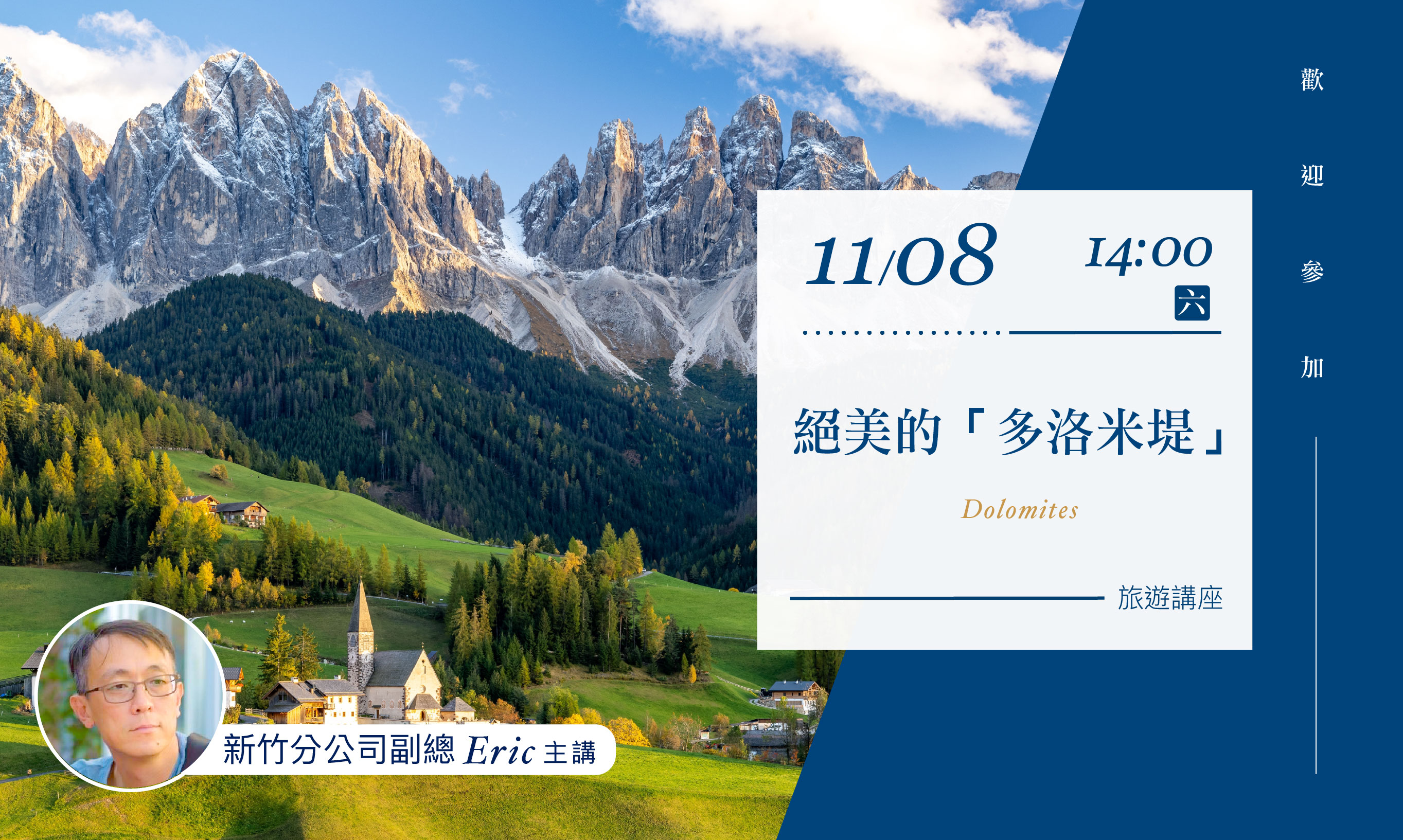 11/08(六)14:00【絕美的「多洛米堤」】旅遊講座(新竹場)