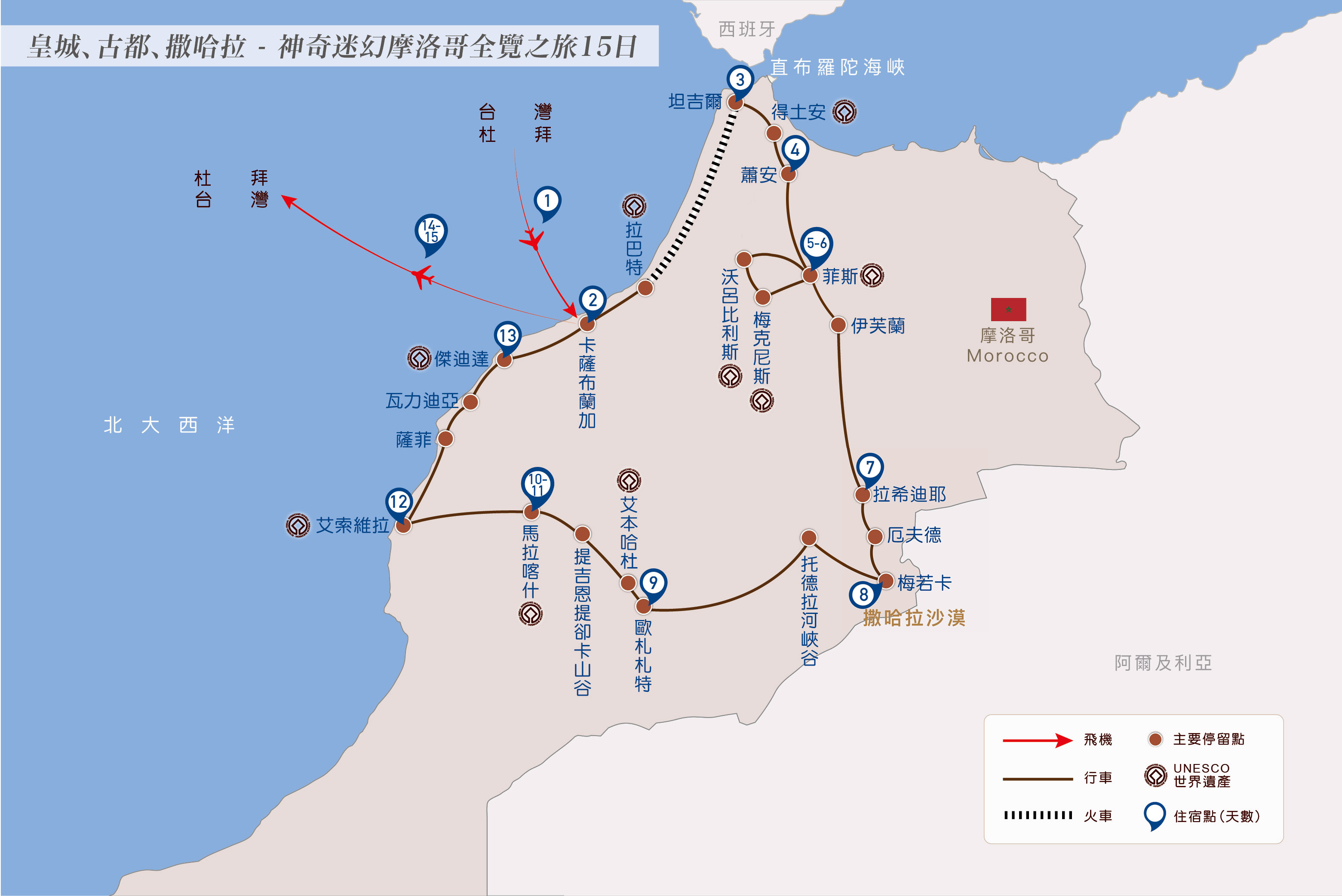 明日自拉巴特搭乘高速鐵路至坦吉爾,行李由巴士載送可能較團員晚抵達飯店,如您想要進飯店時先行盥洗,今晚可準備一換洗包隨行。