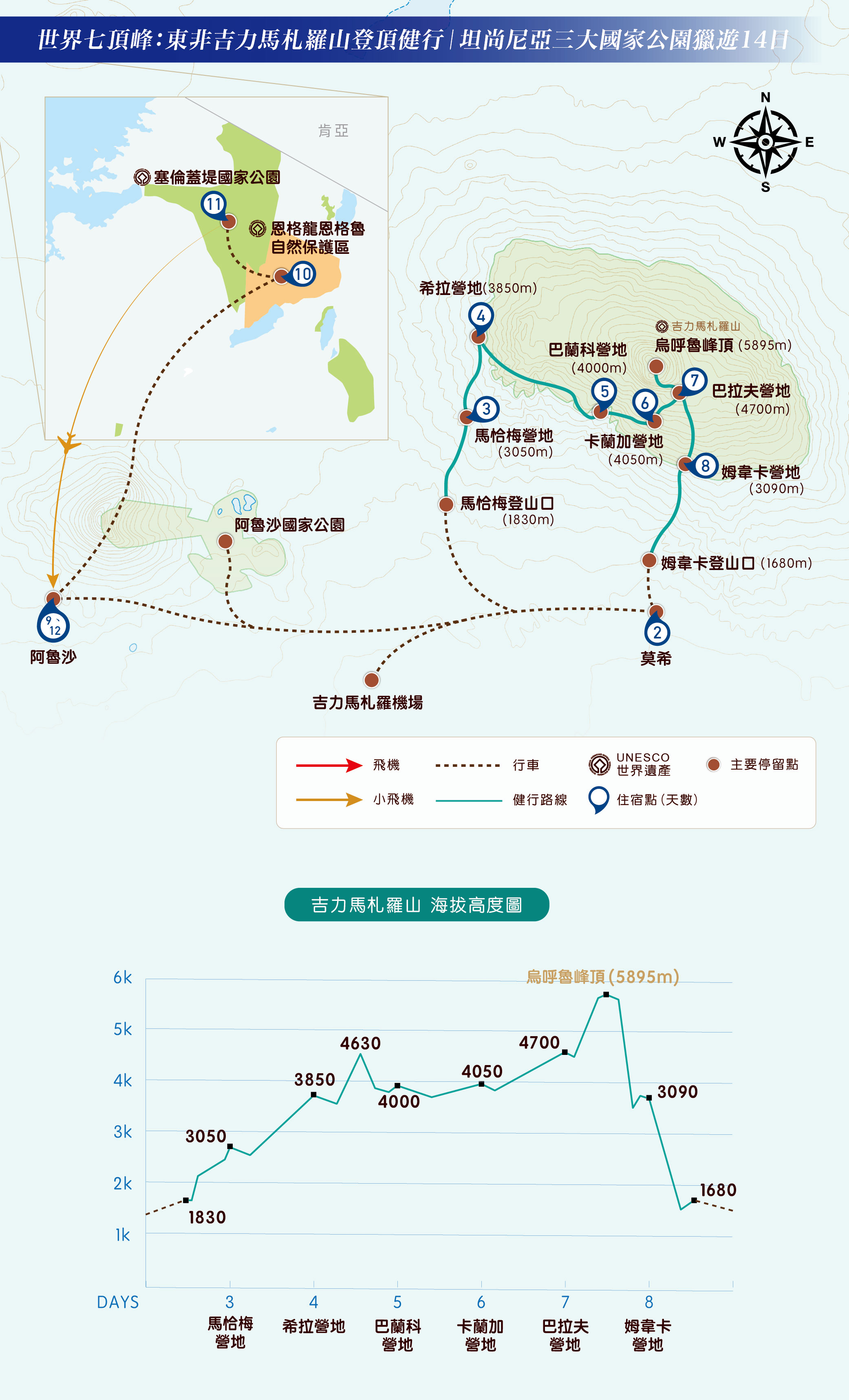 貼心安排走吉力馬札羅山的「威士忌路線」,以七天的路程循序漸進登頂,較能走高睡低以便適應高度變化,且沿途的景觀變化最為豐富,行經五個不同的氣候帶,A點進B點出。全程安排雙人帳篷及舒適睡墊以供休憩,並每日提供乾淨飲用水使用。