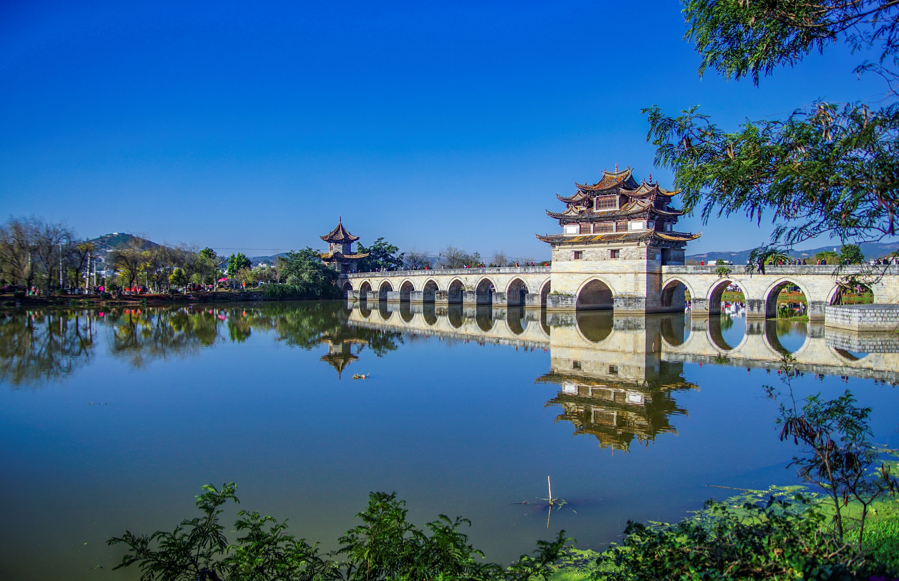 因兩河蜿蜒如龍,故而得名,俗稱「十七孔橋」,是一座三閣十七孔大石拱橋,長148米,寬3-8米,是雲南省著名古跡之一,被認為是雲南省規模最大、藝術價值最高的一座多孔連拱橋,已列入中國造橋史冊,素有「滇南大觀樓」之稱。