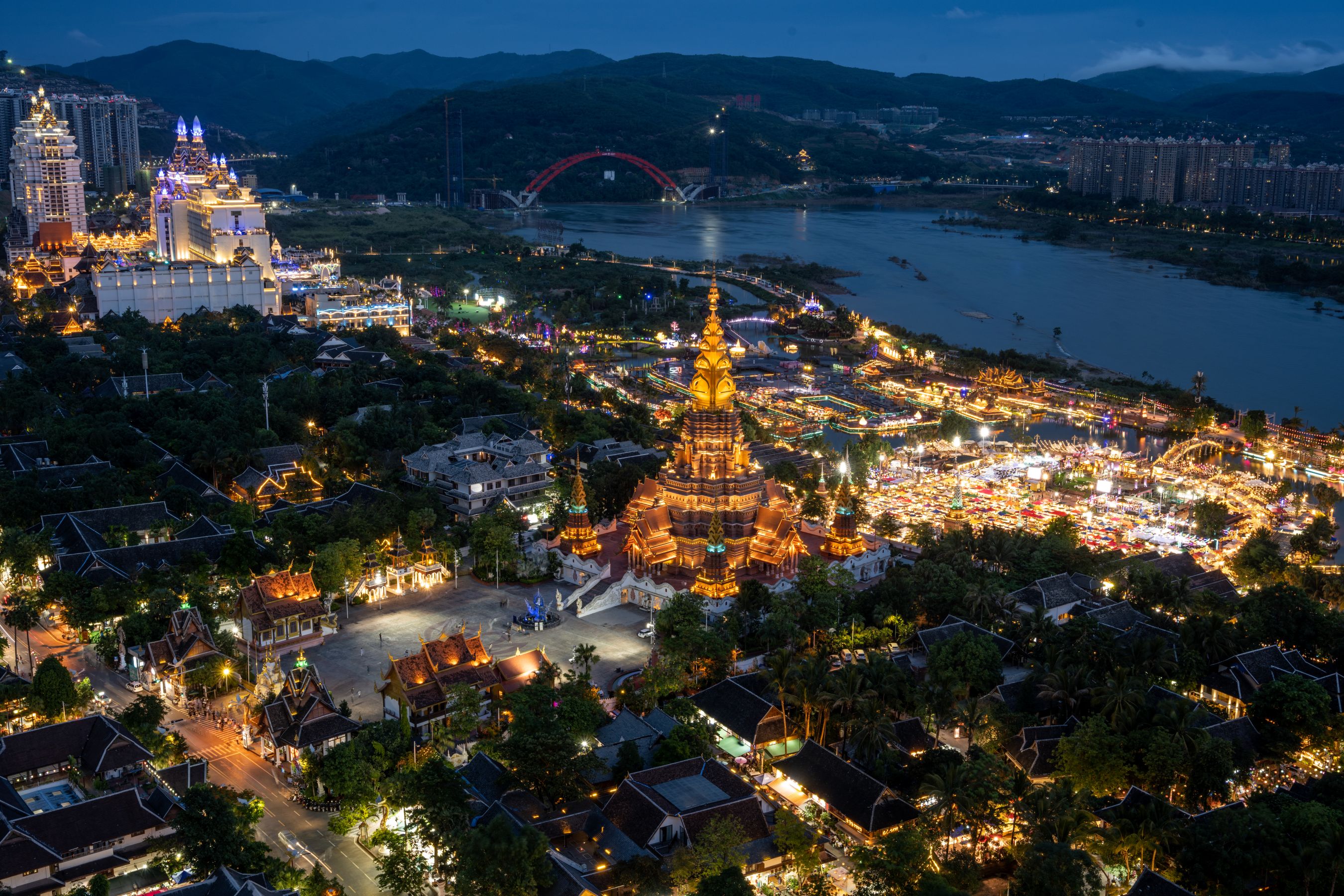 為傣語,漢意為「九塔十二寨」,旨在重現古時景洪盛景,打造一個繁華昌盛的「景洪城中之城」。其根植於西雙版納傣族文化,融合大金三角、湄公河流域傣泰文化精華,引進現代前沿思想,締造前所未有的大金三角傣泰文明之心,引領西雙版納旅遊地產。