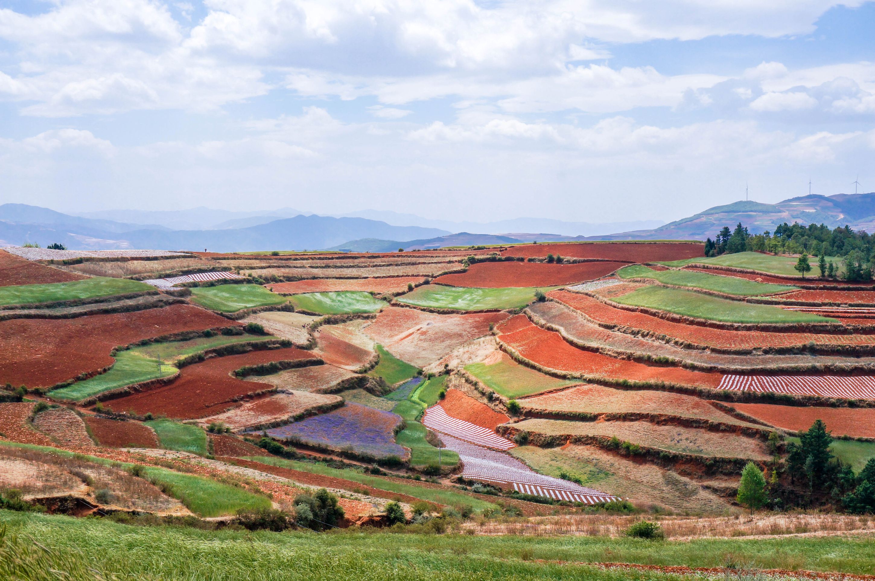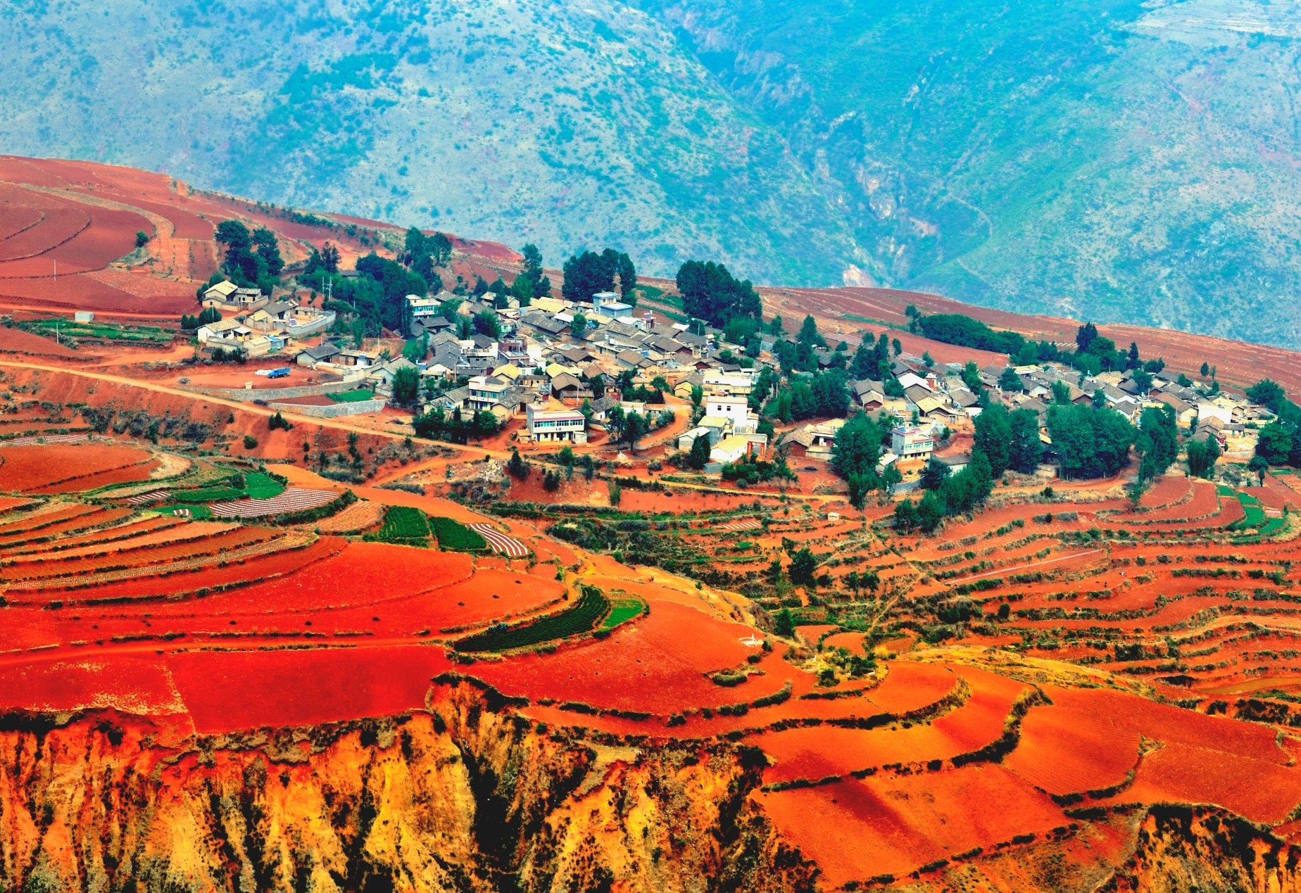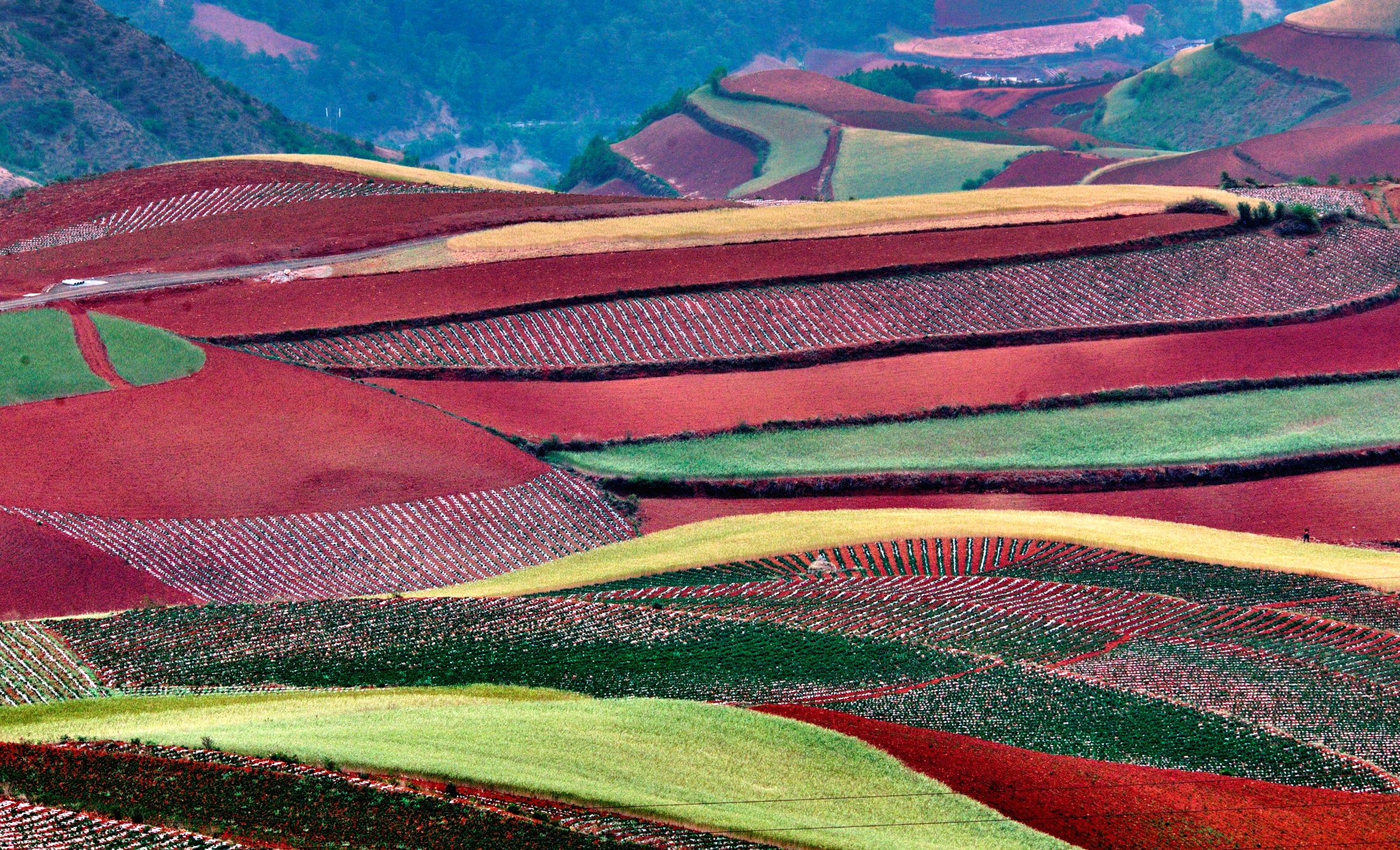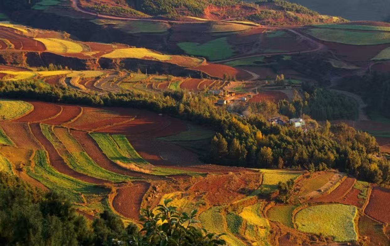 落霞溝也叫陷塘地,是崇山環抱中突然下陷的一塊窪地,有人說落霞溝是紅土地最美的地方之一,不同的季節,落霞溝會呈現出不同的美景,晃如人間仙境。遠遠望去,紅綠相間的色塊和線條,如夢如幻,斑斕的色彩撲面而來,讓人仿佛瞬間忘記了呼吸。