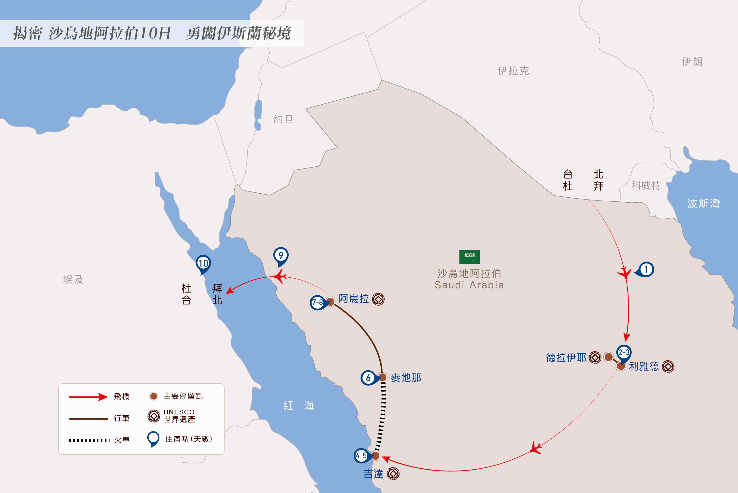 安排吉達五星連泊,沙國第二大城市、第一大港、重要的金融中心。東距麥加約70千米,是漢志省唯一允許非穆斯林居住的城市,也是全世界穆斯林進入麥加和麥地那進行朝覲的陸、海、空交通要道。