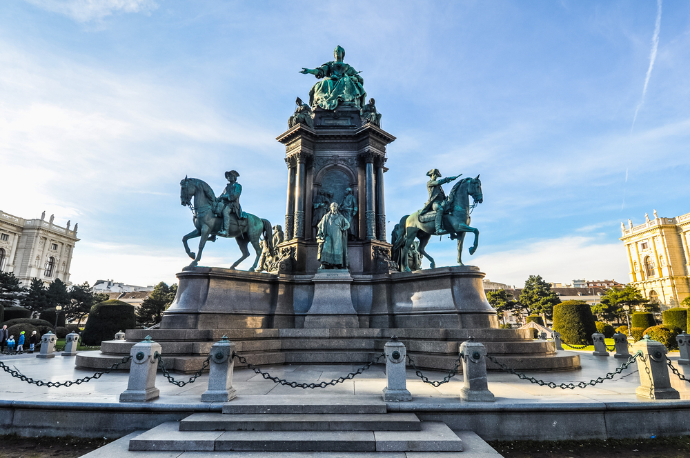 矗立於維也納◎瑪麗亞.特瑞莎廣場,1888年揭幕,以紀念奧地利最偉大的女皇。中央女皇端坐持憲章,象徵智慧與權威,基座四角環繞將領與學者雕像,彰顯治國功績。雕像與兩側的◎藝術史與◎自然史博物館相映成趣,成為帝國榮耀的象徵。