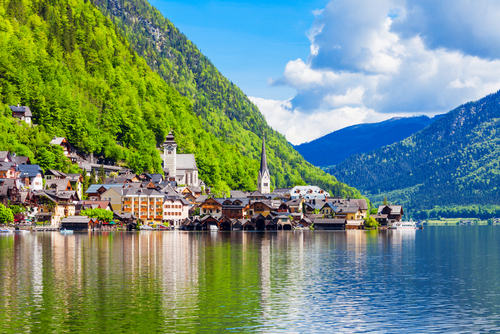 紅瓦木屋依山傍湖,如童話幻境,被譽為「世界最美小鎮」。因鹽礦開採而擁有七千多年歷史,孕育出影響中歐的「哈斯塔特文化」。◎市集廣場小巧雅致,聖三一紀念柱靜立。山坡人骨教堂以彩繪頭骨象徵追憶;湖畔◎福音派教堂新哥德式尖塔映入湖中,成最經典景致。