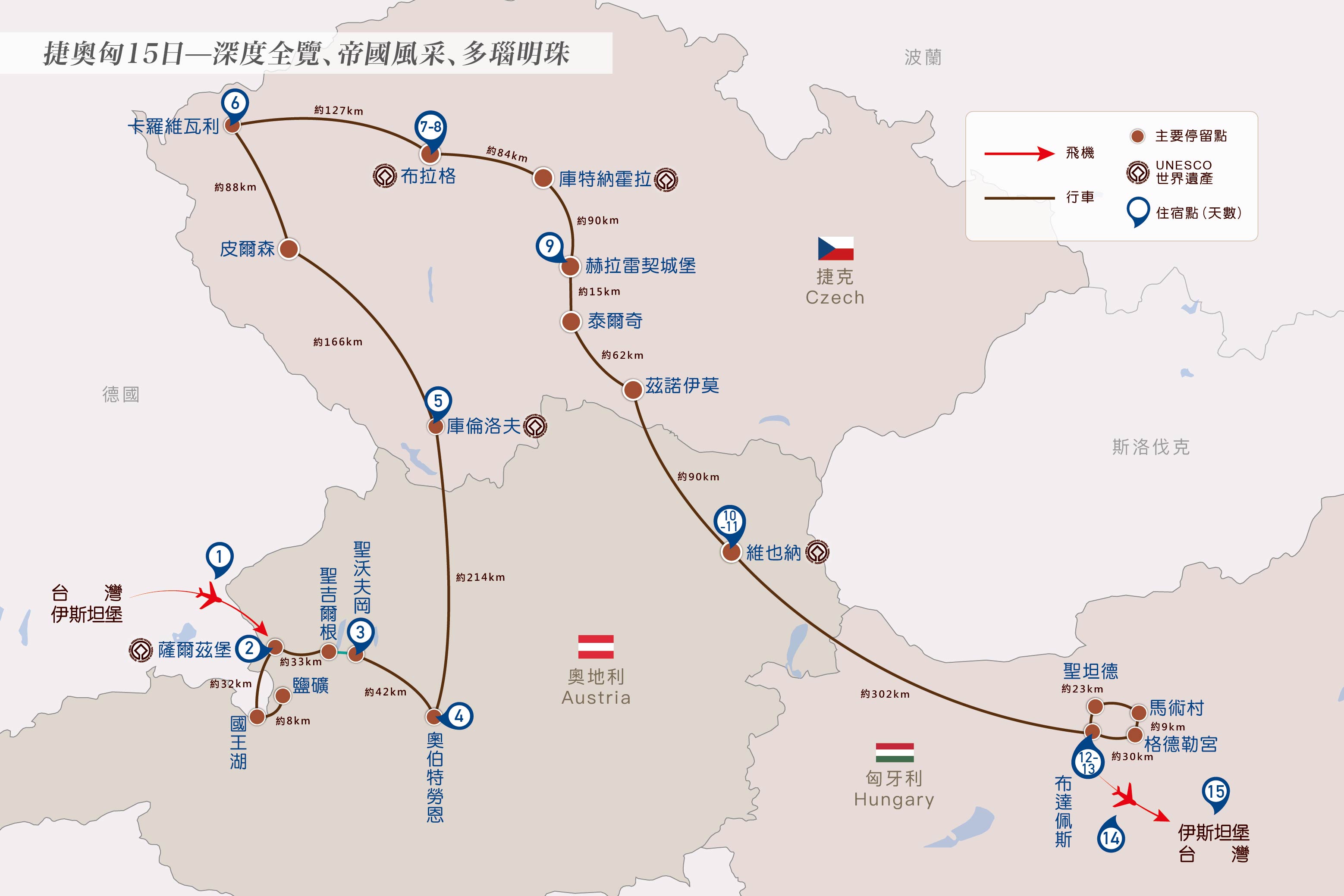 今日桃園機場集合,搭乘土耳其航空經伊斯坦堡飛往音樂之都薩爾茲堡。隔日上午抵達,展開精彩【奧捷匈深度全覽15日】。