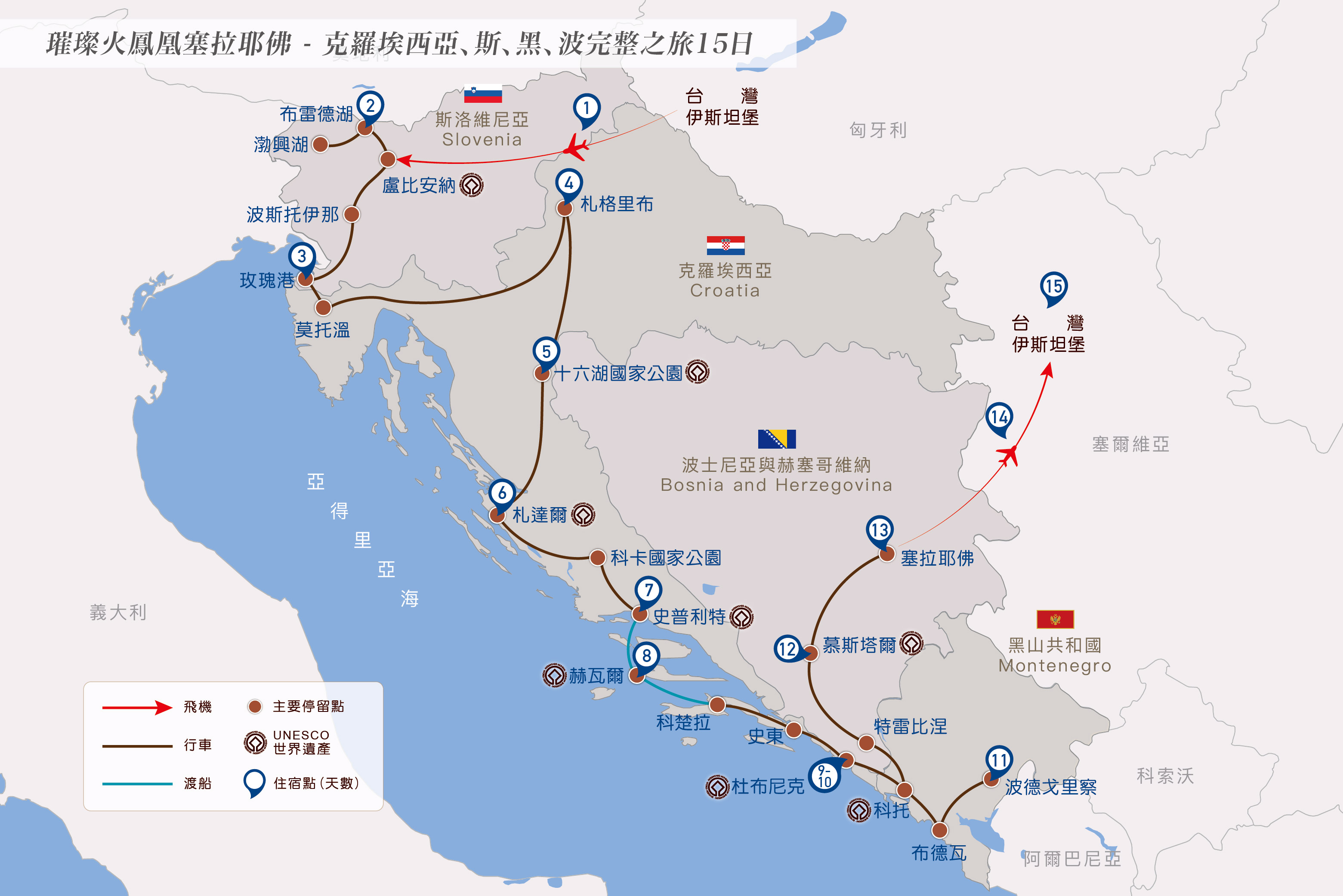 亞得里亞海渡船船班時間隨季節變化而調整,跳島中各景點之參觀順序將視當地船班安排而調整更動;另因赫瓦爾島飯店選擇及房間數有限,如遇島上旺季或舉辦活動而造成無法入住,將改住科楚拉島同星級飯店。
