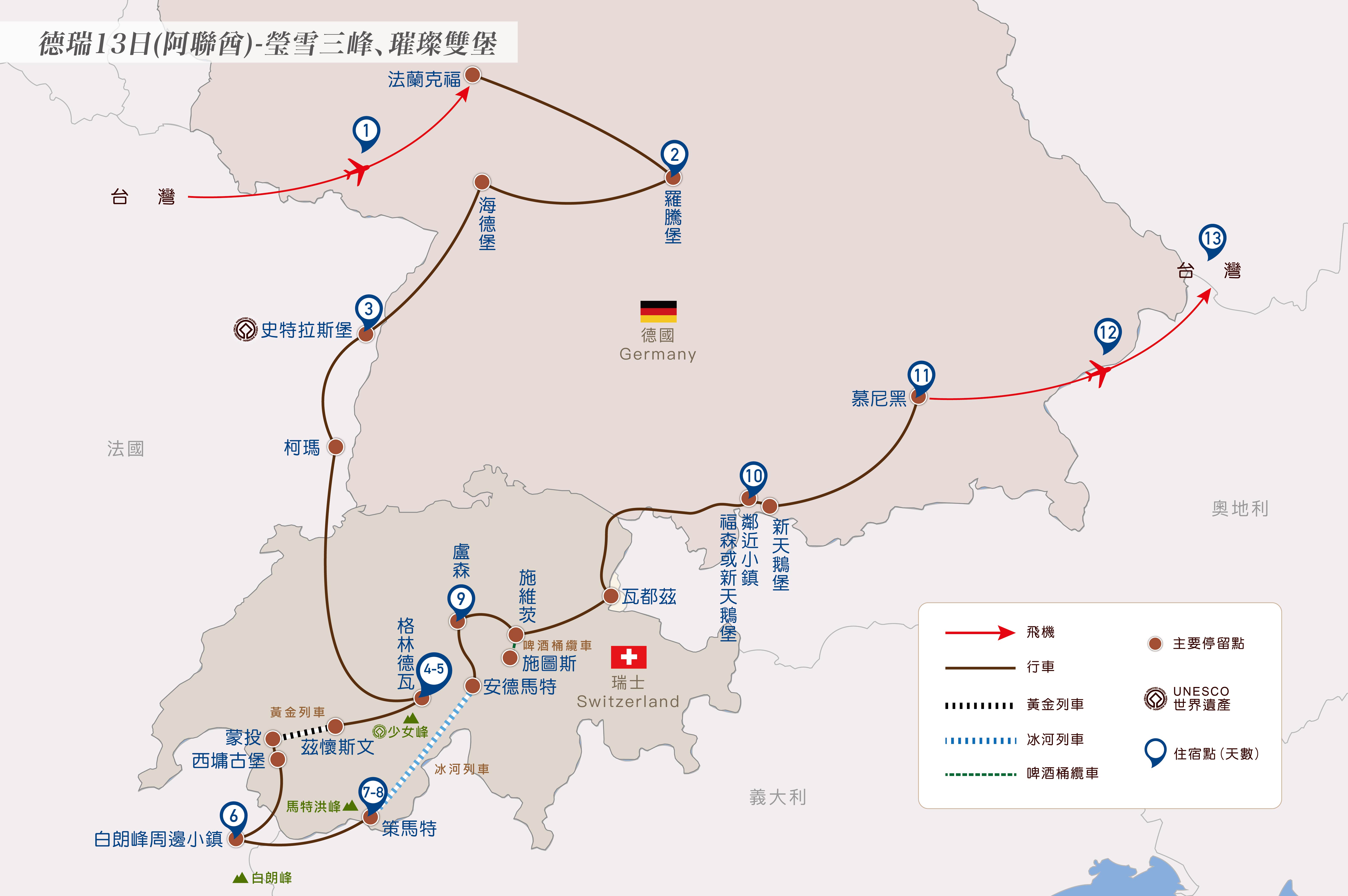 1.新天鵝堡全年遊客絡繹不絕,如當日因故關閉或預約額滿,改參觀浪漫典雅的高天鵝堡,依然能感受巴伐利亞皇室的浪漫風情與歷史氛圍。2.慕尼黑如遇商展或活動滿房,改入住四星飯店每人退費1,500元,敬請諒察。