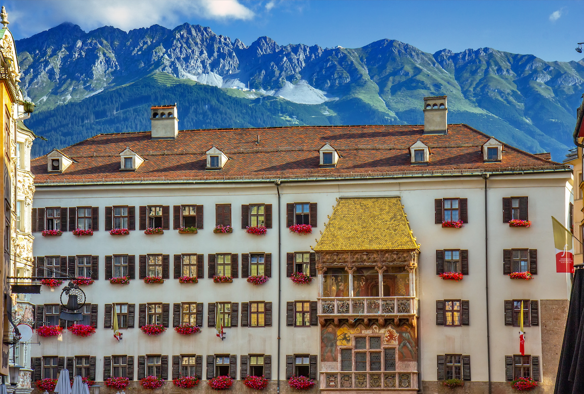 晚期哥德式建築,屋頂以2,657片鎏金銅瓦覆蓋,在陽光照耀下閃耀奪目,因此得名「金色屋頂」。是為了紀念馬克西米連大帝與米蘭公主畢安卡的婚姻,於1496-1500年間建造,作為觀賞廣場上的劍擊、舞蹈及節慶活動而設的觀景台,象徵哈布斯堡榮耀。